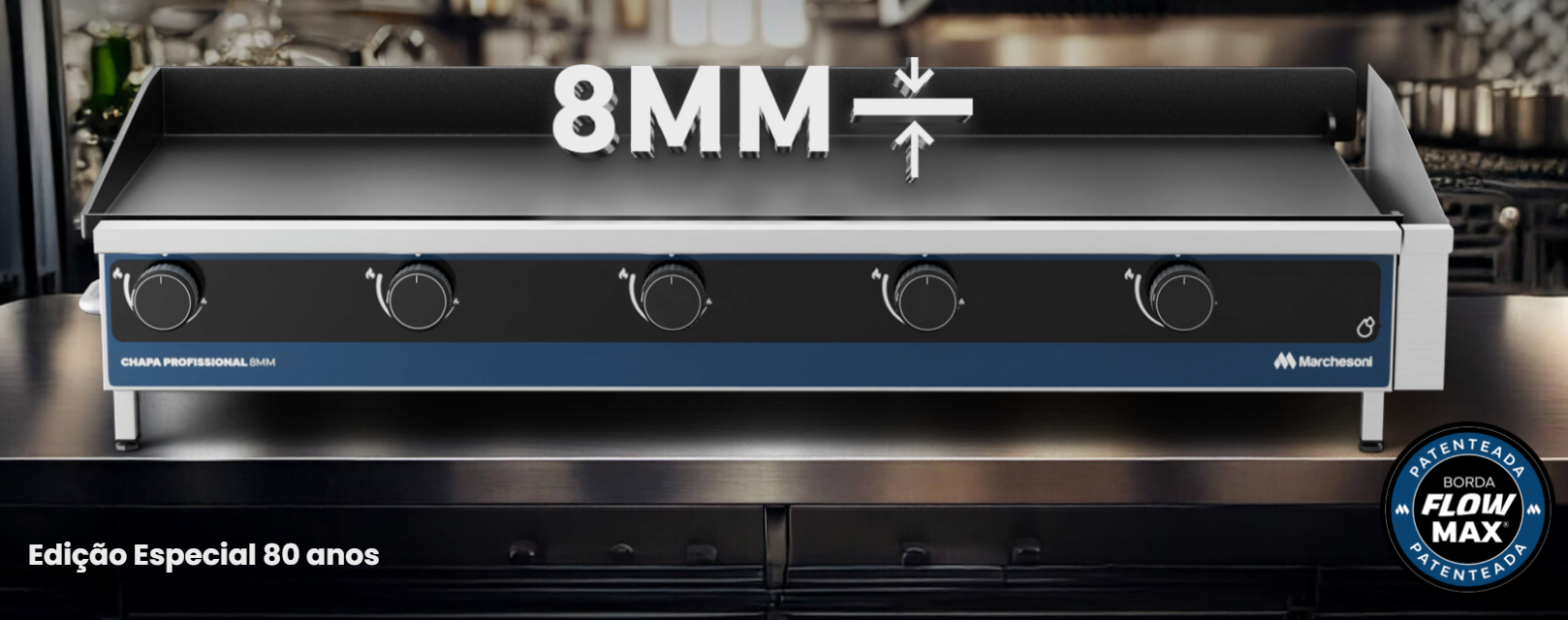 A Chapa a Gás Profissional de 1,00m da Marchesoni é o modelo topo de linha para quem busca produtividade pesada. Diferente da linha comercial, a Linha Profissional possui uma placa de fritura muito mais profunda (51,2 cm contra 37,5 cm da comercial), oferecendo uma área de trabalho significativamente maior para operar com grandes espátulas e altos volumes de proteína.