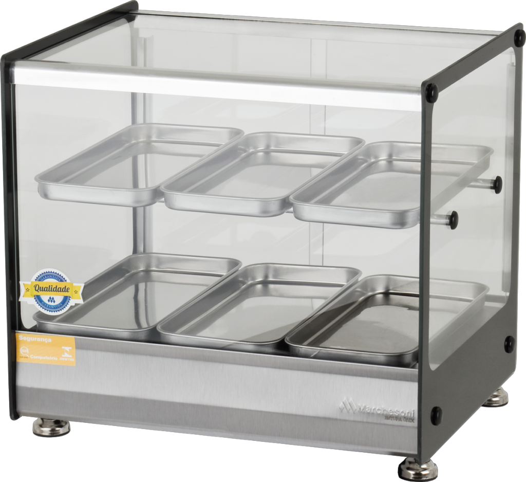 A Estufa Ônix de 06 Bandejas Dupla da Marchesoni é a escolha ideal para estabelecimentos que precisam de alta capacidade de exposição, mas possuem espaço limitado na largura do balcão. Por ser um modelo "Duplo", ela organiza as bandejas em dois níveis (3 em cima e 3 embaixo), otimizando a verticalidade.