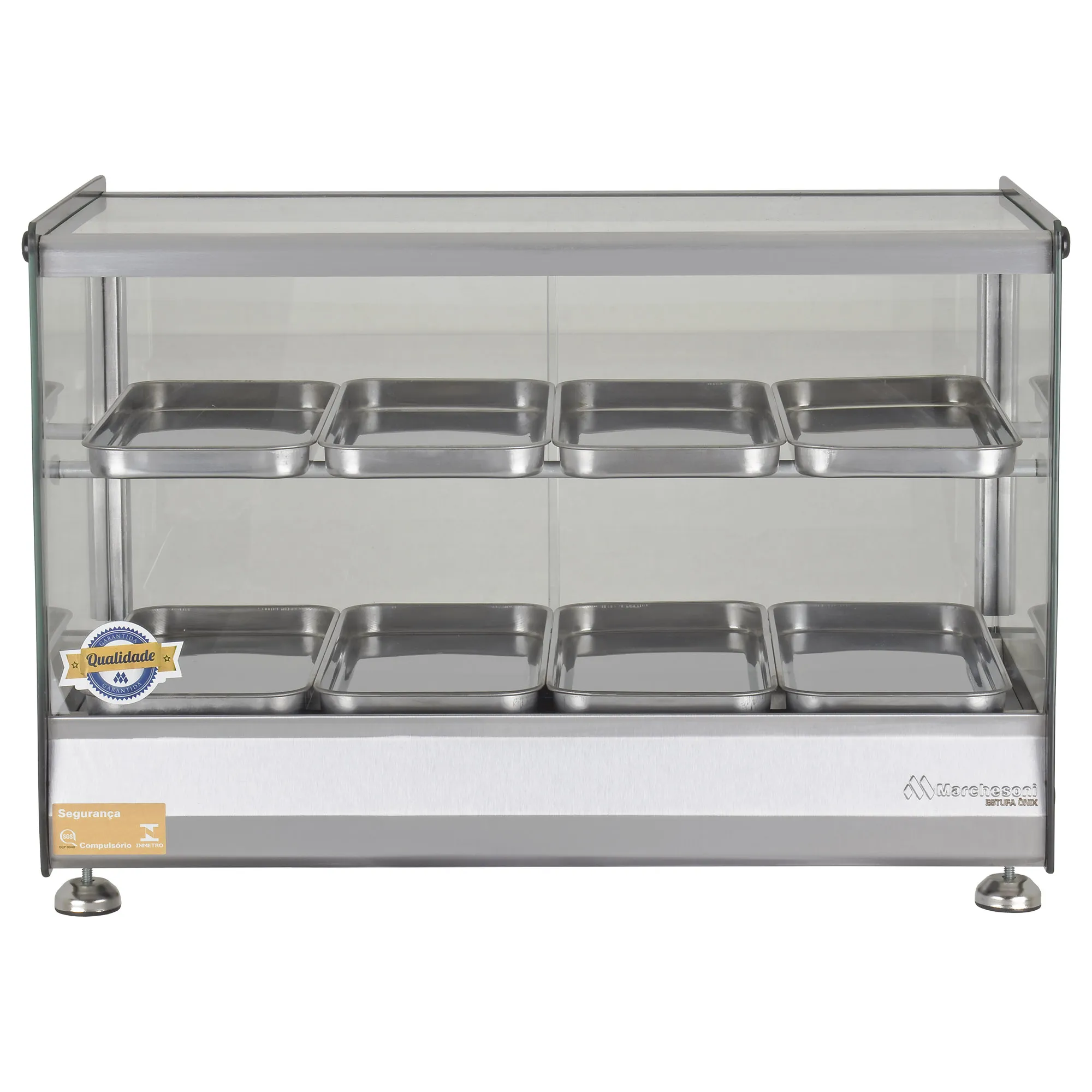 Organização Estratégica: A disposição em dois níveis permite organizar os salgados por tipo (ex: fritos embaixo e assados em cima), facilitando a escolha do cliente.