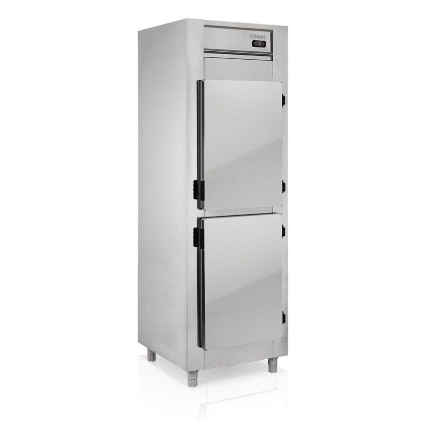 Portas Cegas em Inox: Oferecem um isolamento térmico superior às portas de vidro, o que é fundamental em cozinhas quentes. Além disso, ocultam o estoque interno, mantendo a aparência de organização.